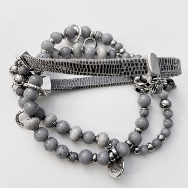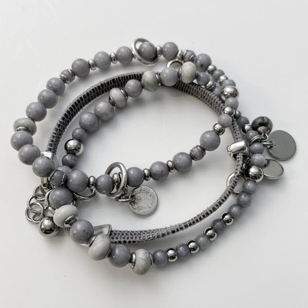 Deze worden afgewisseld met lichtgrijze howliet kralen en rvs onderdelen.