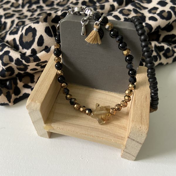 LIEF! Mooie glanzende facetkraaltjes in zwart/camel, zwarte onyx en mooie ster van natuursteen in het midden.